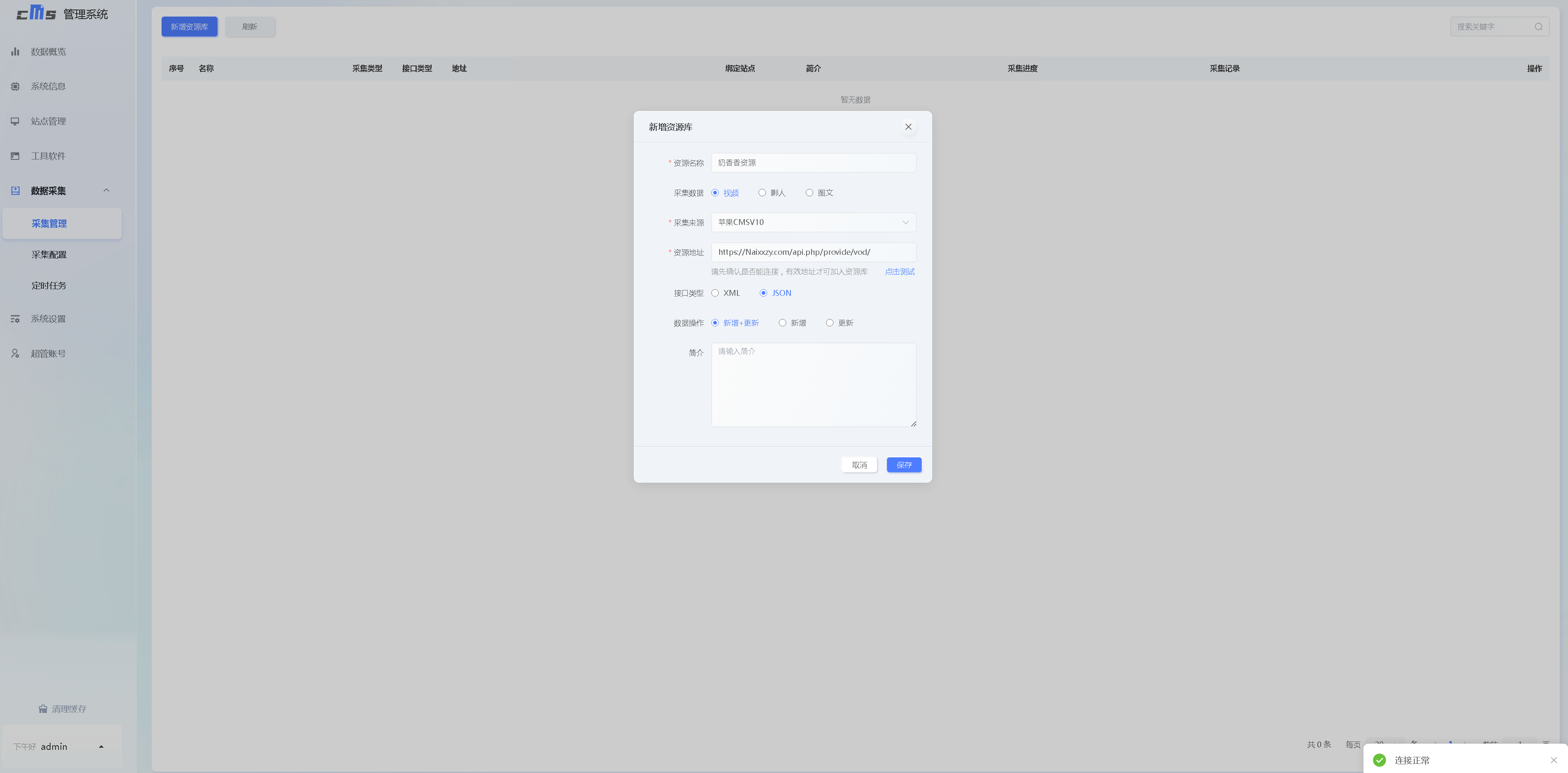 请按以下步骤进行:依次点击【采集】-【资源库管理】,然后依次输入